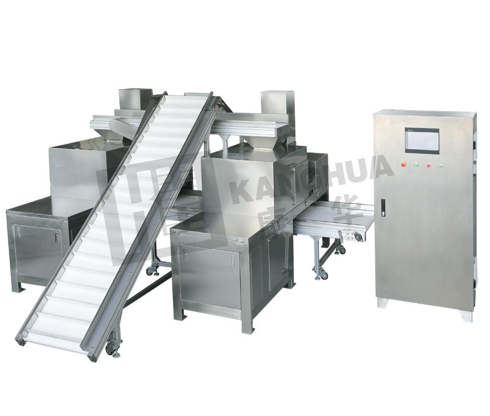 將兩臺單獨的刨片機組合,實現上料,分流,稱重,切制,出料全自動的生產過程。進料端設有輸送式儲料箱,可以儲存較大量原物料,減少人工加料次數。運行全程由PLC微電腦控制操作,具有連續作業、能耗低、產量高等優點。符合GMP要求。
