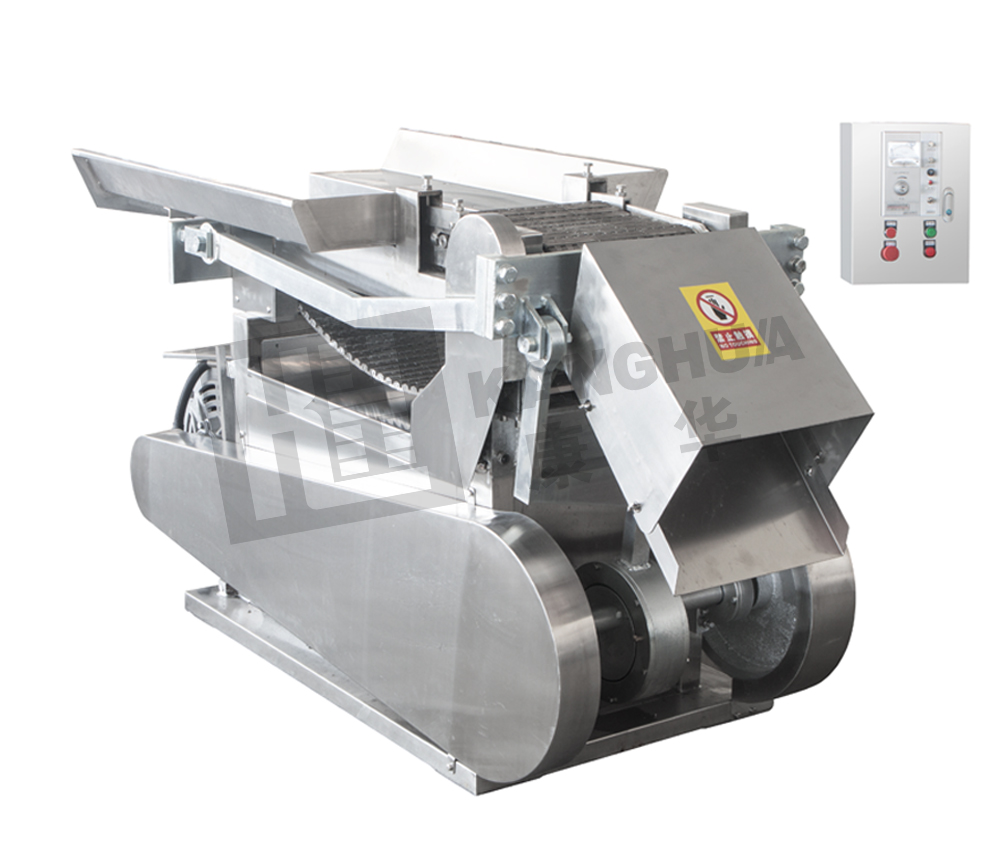 采用機械偏心機構傳動,使刀片上下往復運動,原料經輸送鏈送至刀門,切制成所需要厚度的飲片。